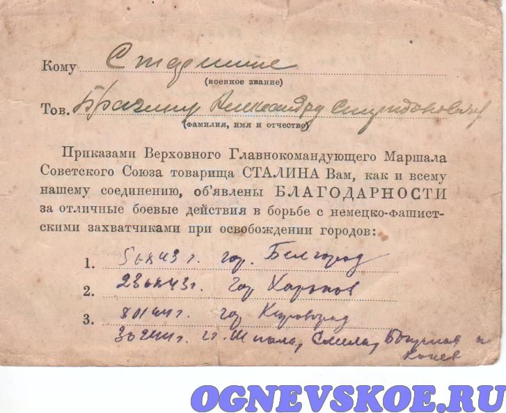 А также были объявлены неоднократные благодарности приказами Верховного Главнокомандующего Маршала Сталина, Маршалов Конева, Жукова, Рокоссовского. Война для него закончилась только в марте 1946 г. т.к. он длительное время после очередного ранения находился на излечении в госпитале г. Полтавы, где был ВЭК комиссован и уволен в запас, как "ограниченно годен".