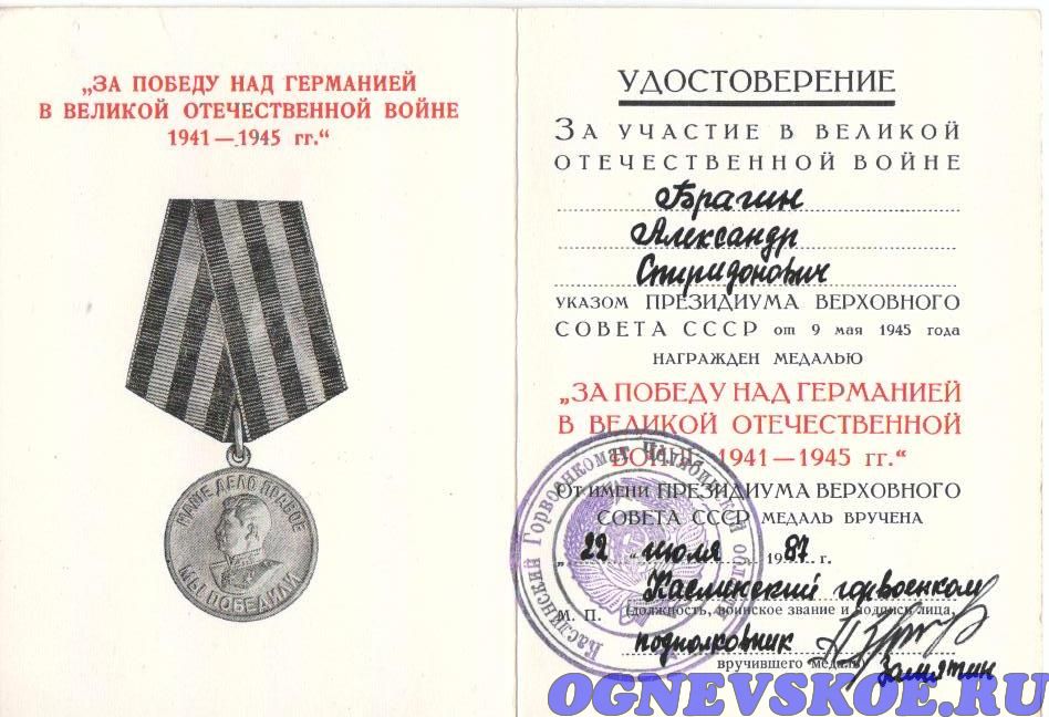 Как у многих семей, в связи с разными событиями, сохранились не все документы и награды, чего очень жаль. Но память потомков о заслуге перед Родиной нашего отца, деда, жива в наших сердцах. И сейчас уже мы вместе с ними, нашими участниками войны, их портретами, ежегодно 9 МАЯ победным строем проходим в рядах бессмертного полка.