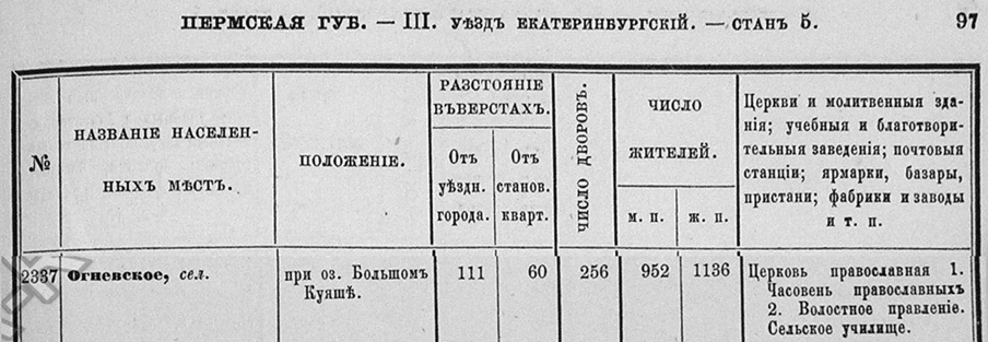 Огневское село (6 благочиние) – 1778 г. дер. Багарякскаго прихода, расположено по озеру «Большой Куяш»; местность низменная, богатая доброкачественной водой; почва «беликовая» песчаная, неудобная для земледелия, почему крестьяне арендуют черноземную землю у башкир, живущих по соседству, в южной стороне от с. Огневскаго; лес березовый, сосна – редкость. К Огневскому приходу, открытому в 1778 году, принадлежали сначала деревни Клепалово и Усть-Караболка, а в 1896 году присоединена была еще деревня Багарякскаго прихода – Давыдова. В приходе Огневском в настоящее время считается обоего пола 3634 чел., все православные. Первый деревянный храм, в честь св. пророка Илии, был построен и освящен в 1778 г. по благословению Варлаама, Епископа Тобольскаго и Сибирскаго, на средства прихожан; в 1824 г. был пристроен и освящен придел во имя св. Великом. Димитрия Солунскаго; в 1827 году деревянный храм заменен каменным, с новым иконостасом в главном храме; в 1878 г., по благословению Епископа Пермскаго и Верхотурскаго Антония, были пристроены еще два придела каменных, правый – в честь св.Великом. Димитрия Солунскаго, а левый – св. Георгия Победоносца. К Огневскому приходу приписано село Клепаловское; храм в этом селе устроен лишь в 1888 году во имя Сретения Господня. В приходе 7-мь часовень: 1) деревянная во имя св. Николая, Мирлик. Чудотворца, в дер. Усть-Караболке (название дер. от р. Караболки, на устье которой она и расположена); 2) в честь Знамения Божией Матери в дер. Давыдовой, деревянная; 3) в честь св. безсребр. Космы и Дамиана – в дер. Шадрята, деревянная; 4) Успенская – каменная. 5) Преображенская – деревянная, 6) Георгиевская – каменная и 7) Пантелеимоновская – каменная, все четыре – в селе Огневском. Во дни тех Святых, в честь которых устроены часовни, к последним из местнаго храма ежегодно совершаются крестные ходы. В селе Огневском две школы: земская смешанная школа и школа грамоты; последняя открыта лишь в 1901 году