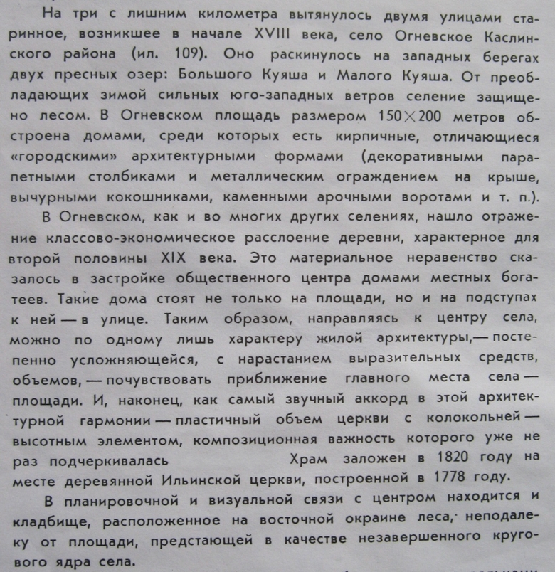 Огневское село (6 благочиние) – 1778 г. дер. Багарякскаго прихода, расположено по озеру «Большой Куяш»; местность низменная, богатая доброкачественной водой; почва «беликовая» песчаная, неудобная для земледелия, почему крестьяне арендуют черноземную землю у башкир, живущих по соседству, в южной стороне от с. Огневскаго; лес березовый, сосна – редкость. К Огневскому приходу, открытому в 1778 году, принадлежали сначала деревни Клепалово и Усть-Караболка, а в 1896 году присоединена была еще деревня Багарякскаго прихода – Давыдова. В приходе Огневском в настоящее время считается обоего пола 3634 чел., все православные. Первый деревянный храм, в честь св. пророка Илии, был построен и освящен в 1778 г. по благословению Варлаама, Епископа Тобольскаго и Сибирскаго, на средства прихожан; в 1824 г. был пристроен и освящен придел во имя св. Великом. Димитрия Солунскаго; в 1827 году деревянный храм заменен каменным, с новым иконостасом в главном храме; в 1878 г., по благословению Епископа Пермскаго и Верхотурскаго Антония, были пристроены еще два придела каменных, правый – в честь св.Великом. Димитрия Солунскаго, а левый – св. Георгия Победоносца. К Огневскому приходу приписано село Клепаловское; храм в этом селе устроен лишь в 1888 году во имя Сретения Господня. В приходе 7-мь часовень: 1) деревянная во имя св. Николая, Мирлик. Чудотворца, в дер. Усть-Караболке (название дер. от р. Караболки, на устье которой она и расположена); 2) в честь Знамения Божией Матери в дер. Давыдовой, деревянная; 3) в честь св. безсребр. Космы и Дамиана – в дер. Шадрята, деревянная; 4) Успенская – каменная. 5) Преображенская – деревянная, 6) Георгиевская – каменная и 7) Пантелеимоновская – каменная, все четыре – в селе Огневском. Во дни тех Святых, в честь которых устроены часовни, к последним из местнаго храма ежегодно совершаются крестные ходы. В селе Огневском две школы: земская смешанная школа и школа грамоты; последняя открыта лишь в 1901 году